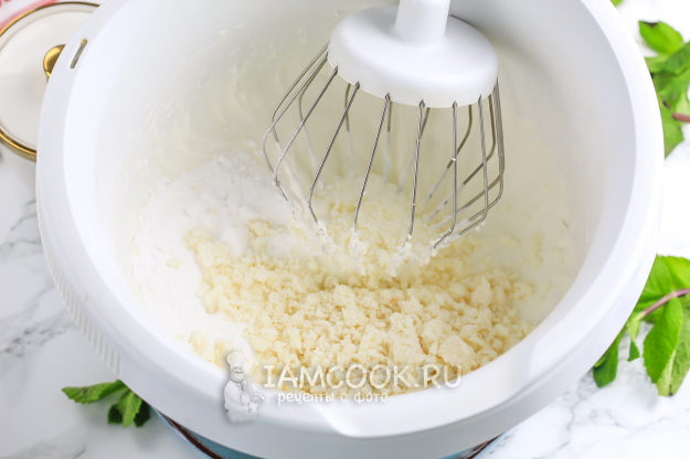 Измельчите творог и всыпьте его во взбитые сливки вместе с сахарной пудрой. Взбейте еще 1-2 минуты.