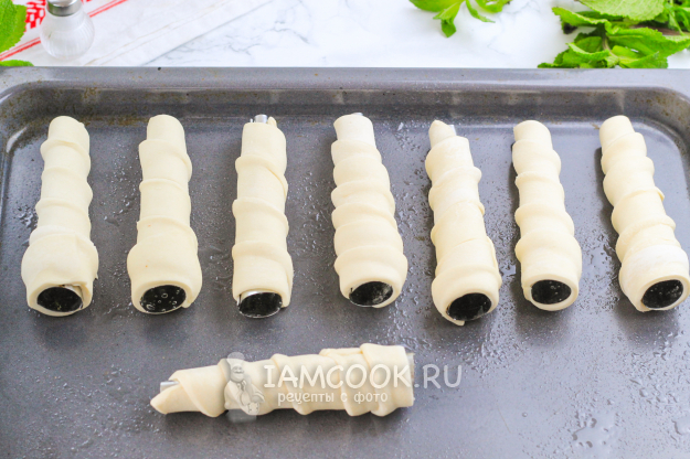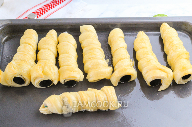 Сбрызните растительным маслом противень и выложите на него трубочки. Разогрейте духовку до 180 градусов и испеките их 15 минут.