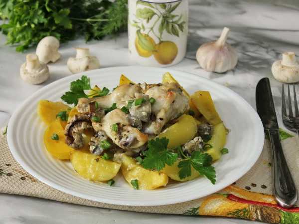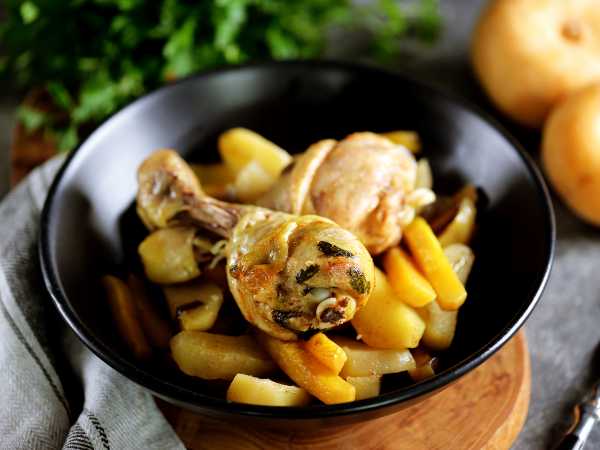 Готовить куриные голени для полезного питания нужно в огнеупорной посуде с крышкой. Это может быть форма для запекания с крышкой, как у меня или керамический горшок с крышкой. Если такой посуды нет, то просто используйте форму для запекания и закройте верх двойным слоем фольги, чтобы голени томились в духовке.
