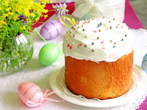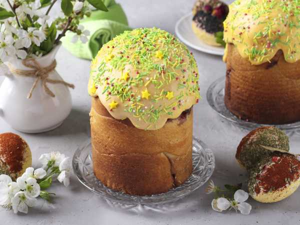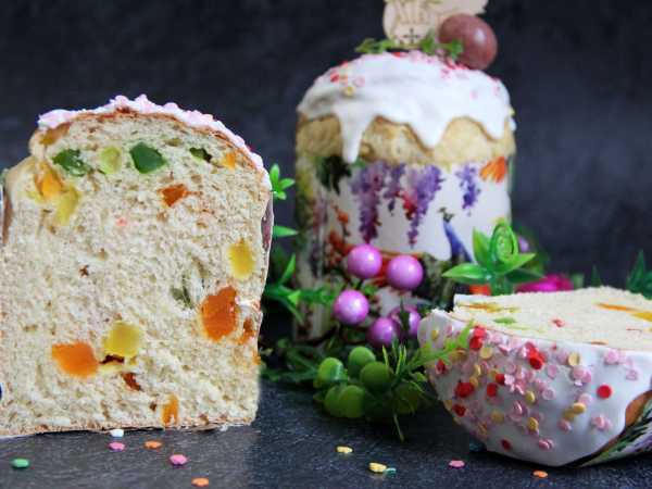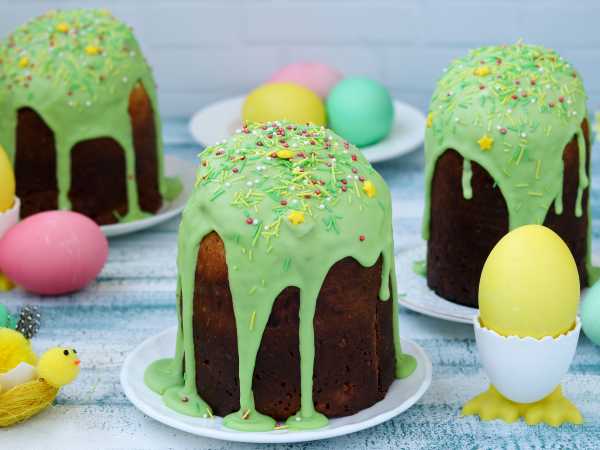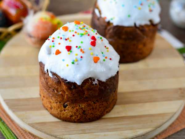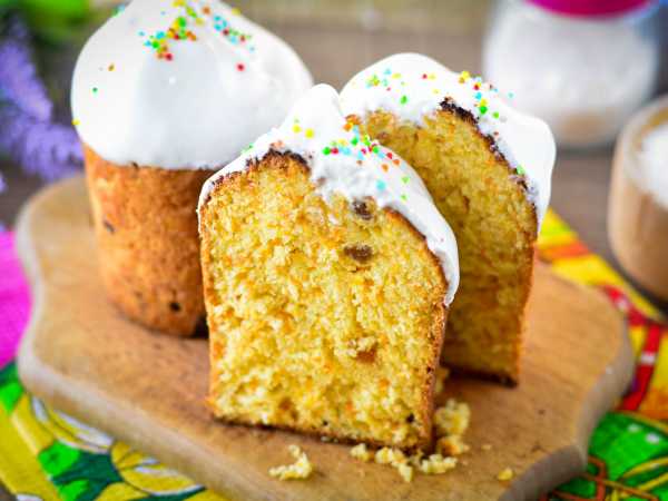 Для глазури смешать сахарную пудру и 5-6 ст.л. апельсинового сока, хорошо перемешать. Готовой глазурью украсить остывшие куличи.