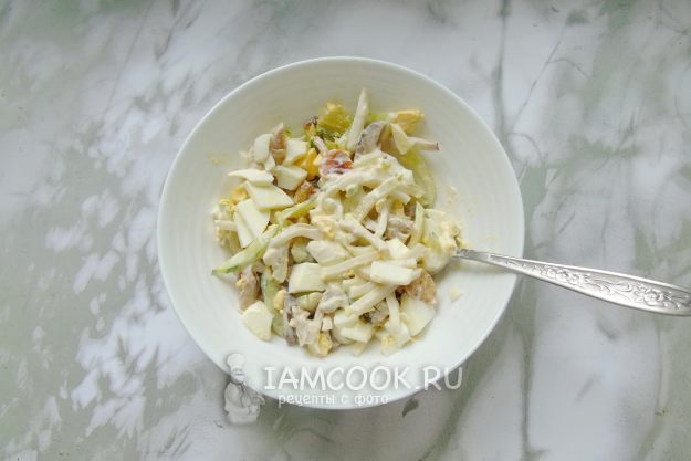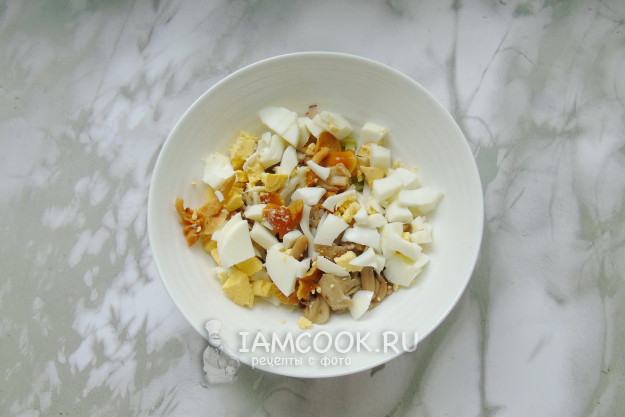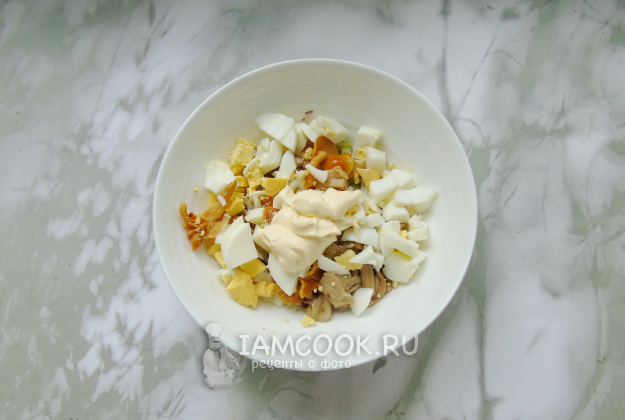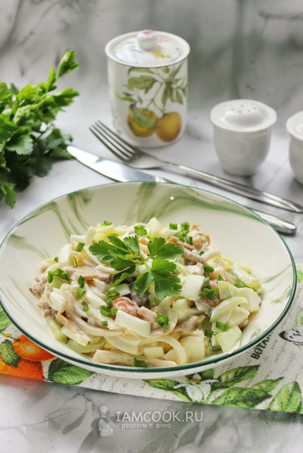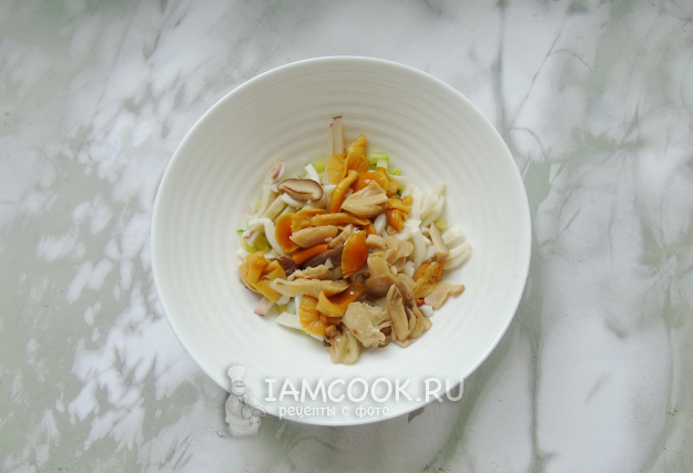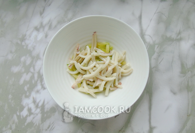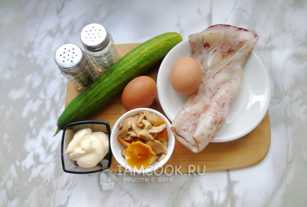 Соберите ингредиенты для приготовления салата с кальмарами и маринованными грибами.