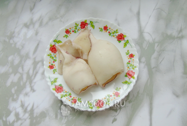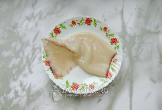 Кальмаров разморозьте и очистите от пленки. Выпотрошите, если нужно, уберите хорду, хорошо помойте.