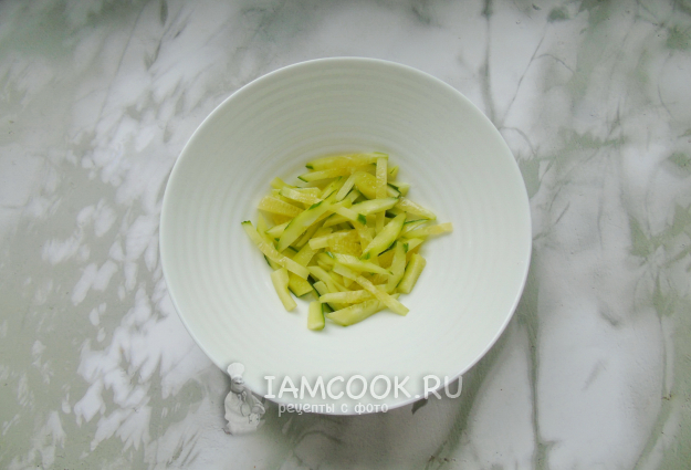 Свежий огурец помойте, очистите и нарежьте соломкой.