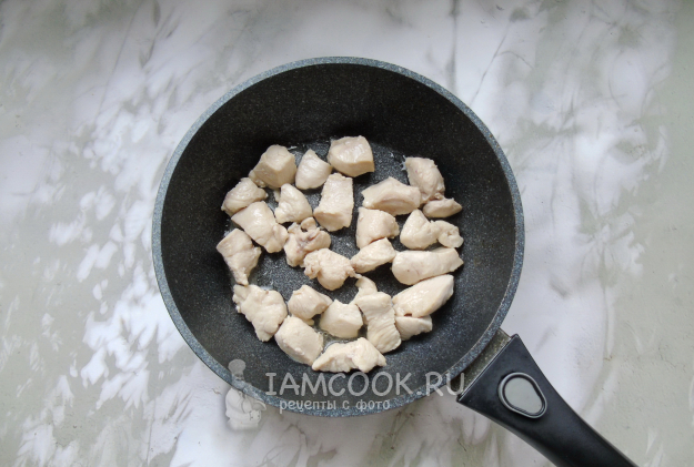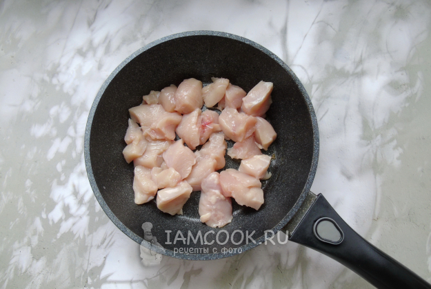 Куриное филе нарежьте кусочками, выложите в сковороду с растительным маслом.