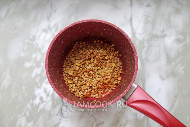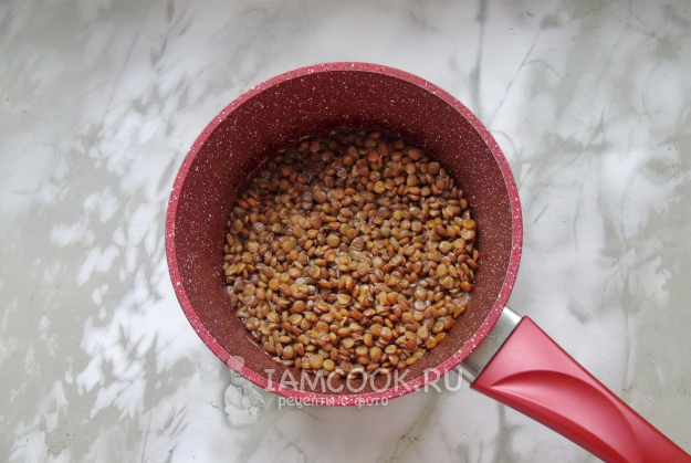 Зеленую чечевицу помойте и выложите в кастрюлю с толстым дном или антипригарным покрытием. Заранее замачивать чечевицу не нужно.