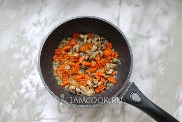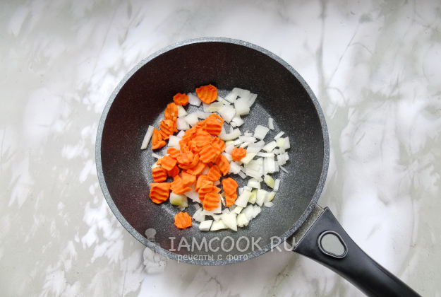 А тем временем репчатый лук и морковь нарежьте произвольно. Выложите в сковороду.