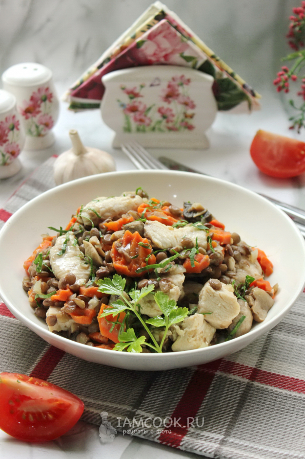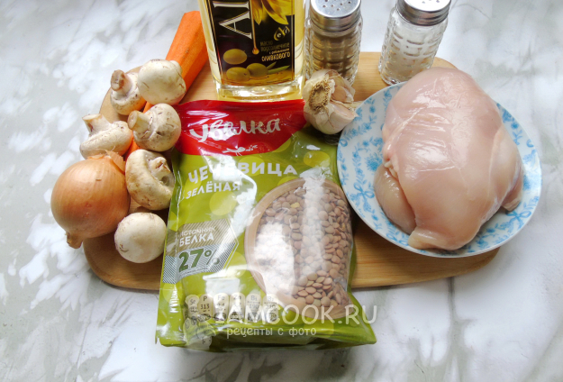 Соберите ингредиенты для приготовления курицы с зеленой чечевицей.