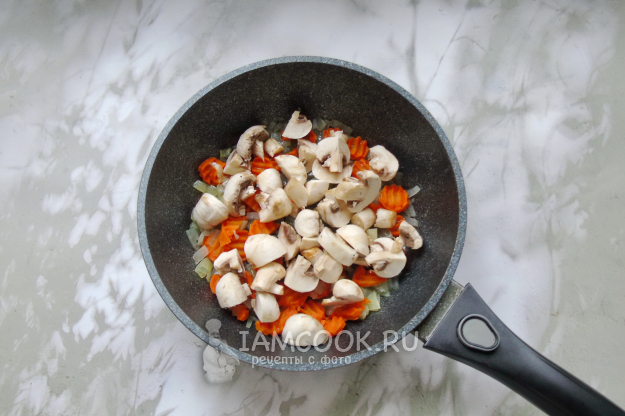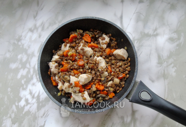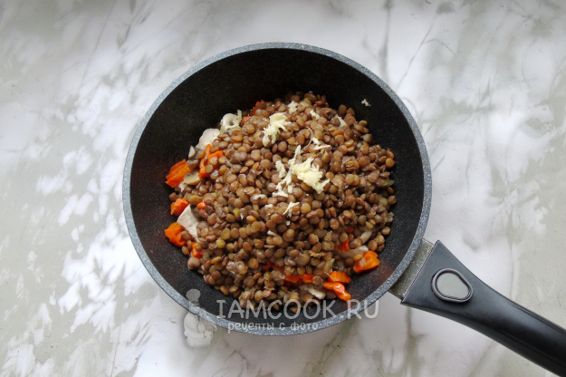 Затем добавьте овощи с грибами, чечевицу и чеснок, измельченный любым способом. Поперчите блюдо.