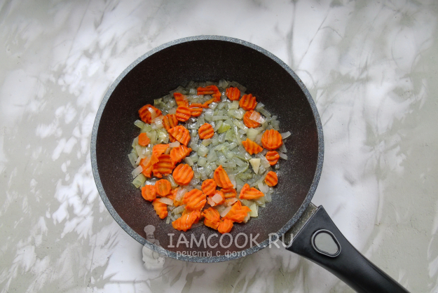 Налейте подсолнечное масло и жарьте овощи до прозрачности лука.