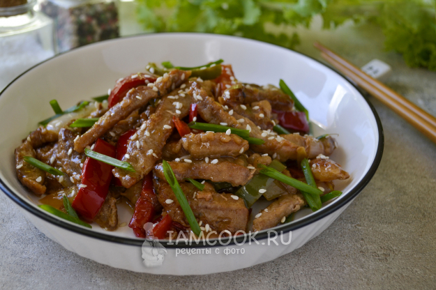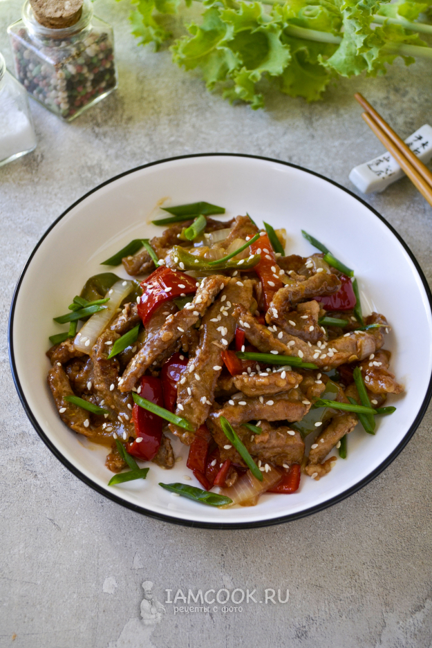 Мясо «веревочкой» по-китайски готово. Подавайте его горячим. Посыпьте обжаренным кунжутом и зеленым луком.
