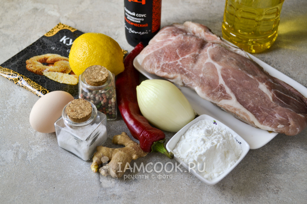 Соберите продукты для приготовления мяса «веревочкой» по-китайски. Свинину промойте и обсушите, овощи вымойте и почистите.