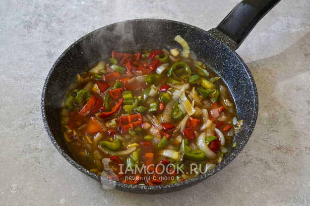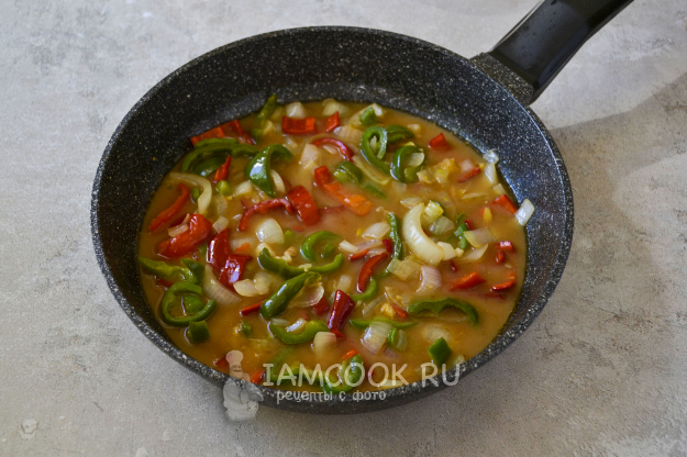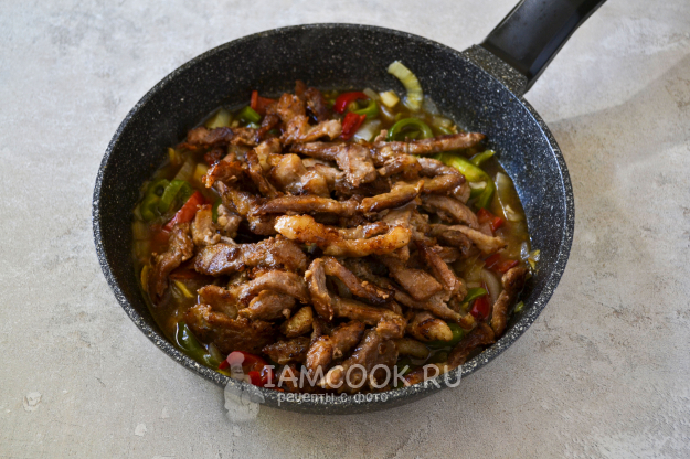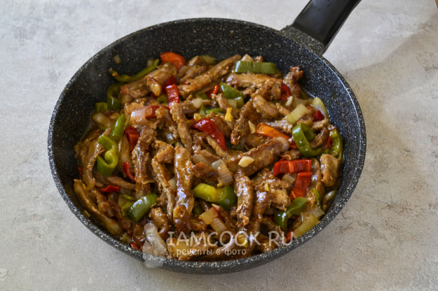 Перемешайте мясо с соусом и овощами, прогрейте еще 2-3 минуты и снимайте с огня.