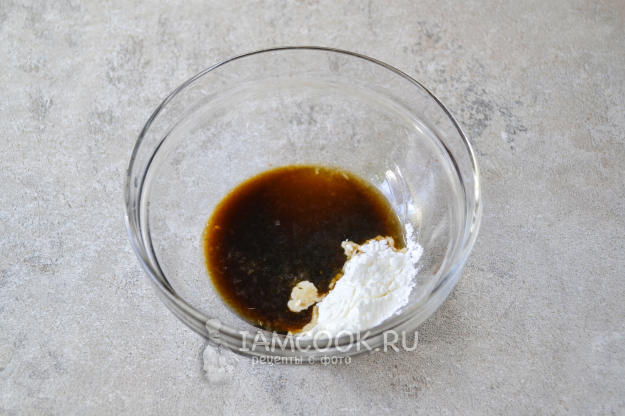 Приготовьте маринад для мяса. В глубокую миску влейте соевый соус, поперчите, посолите, всыпьте крахмал.