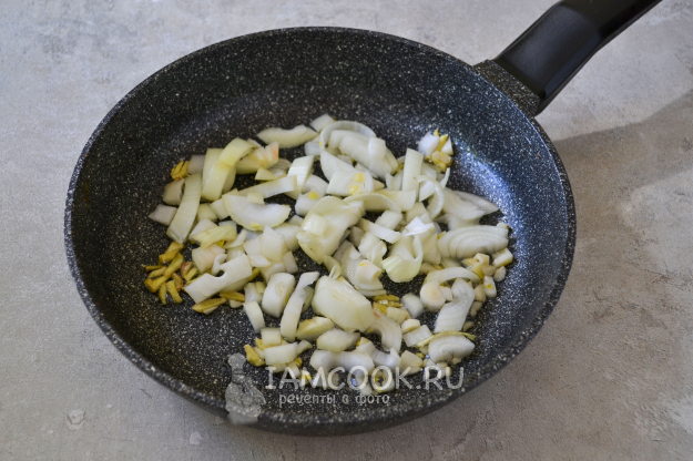 Обжарьте пару минут и положите нарезанный крупной соломкой репчатый лук.