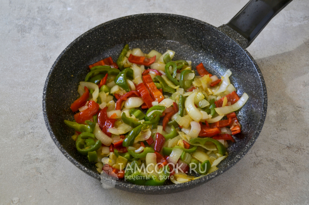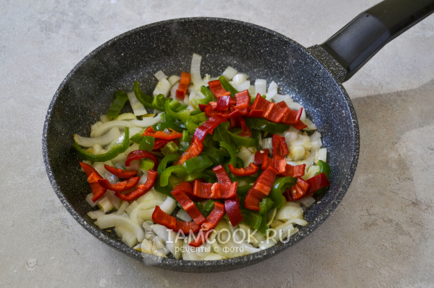 На сильном огне обжарьте лук, помешивая, 1-2 минуты и добавьте нарезанный такой же соломкой перец. Перец предварительно разрежьте и удалите семена и хвостик. Для приготовления можно взять перец разных цветов, так блюдо будет аппетитнее и ярче смотреться.