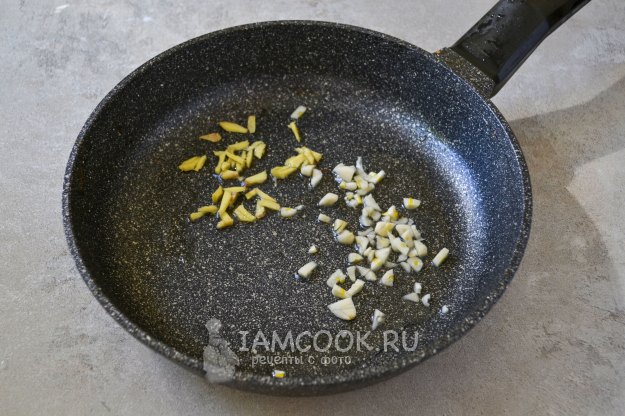 Налейте на сковороду немного растительного масла, положите мелко нарезанный чеснок и нарезанный тонкой соломкой имбирь.