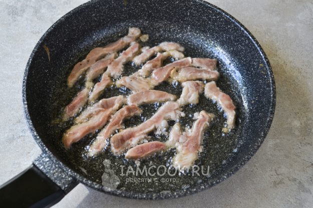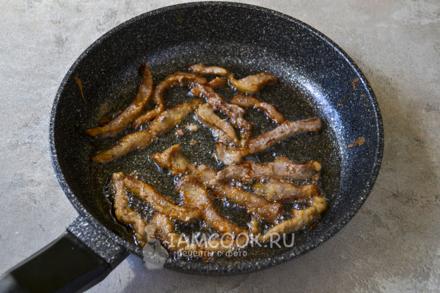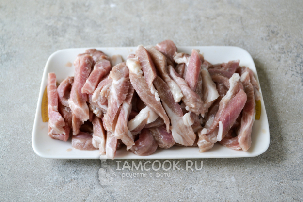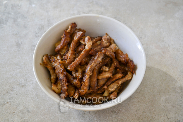 Мясо нарежьте тонкой соломкой. Мясо удобнее нарезать, когда оно будет слегка подморожено.