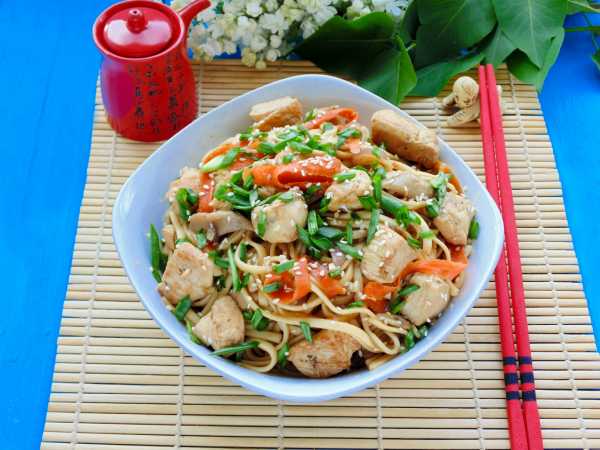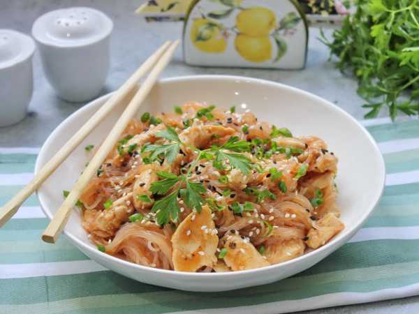А сверху выложите куски варёной домашней курицы. Если вам удобнее есть такое блюдо без костей, то снимите куриное мясо с косточек и добавьте в сковороду мякоть курицы.