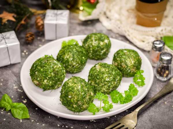 Через указанное время сформируйте из приготовленной массы шарики мороженого и обваляйте в крошке из крабовых палочек.