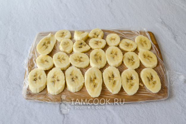 Банан очистите и нарежьте на тонкие кружочки. Разложите нарезанный банан на разделочную доску, которую застелите пищевой пленкой. Поставьте доску в морозильную камеру, чтобы банан полностью застыл.