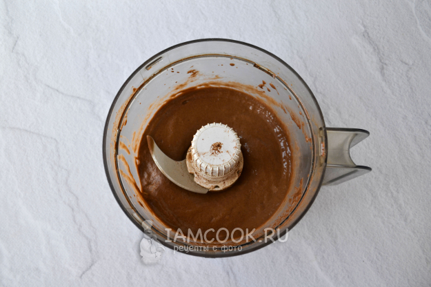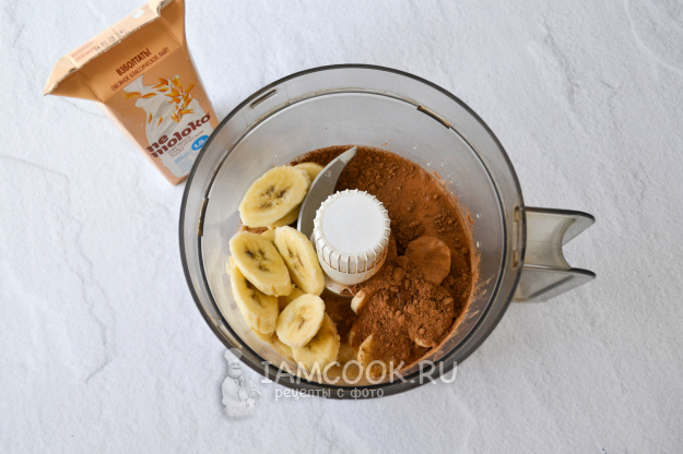 Замороженные кружочки банана переложите с доски в чашу измельчителя, влейте овсяное молоко и добавьте какао-порошок.