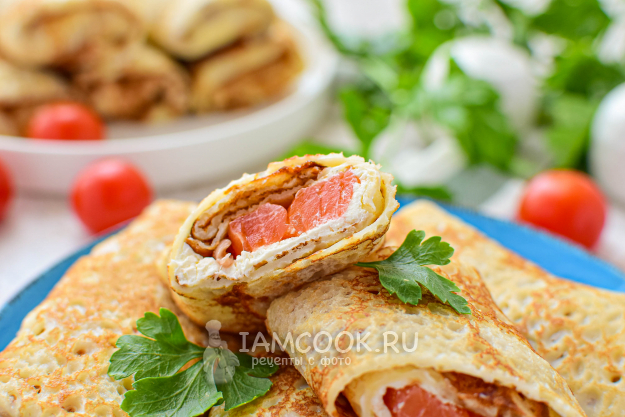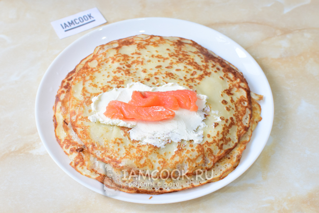 На каждый блинчик намажьте маскарпоне и выложите сёмгу. Заверните блинчики начинкой внутрь.