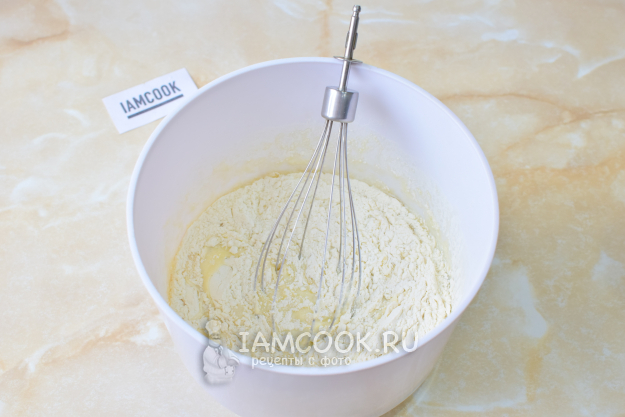 Муку просейте через сито, чтобы насытить её кислородом. Постепенно вмешивайте муку в тесто. Густоту теста регулируйте добавлением муки и молока.