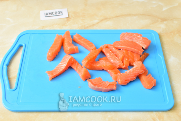 Сёмгу нарежьте брусочками, удаляя косточки.
