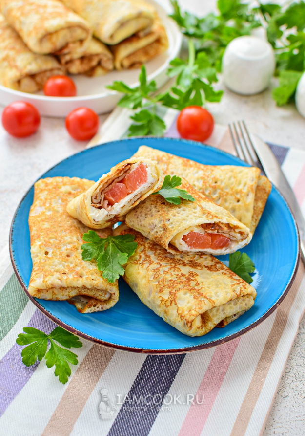 Готовые блины с маскарпоне и семгой можно сразу подавать к столу. Приятного аппетита!