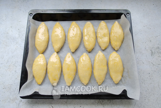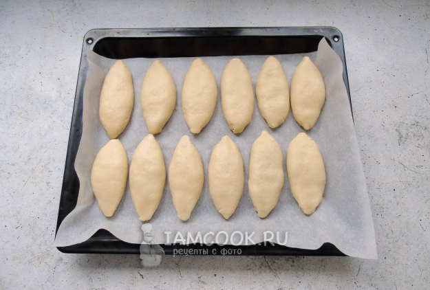 Сформированные таким образом пирожки выложите на противень с пекарской бумагой швом вниз.
