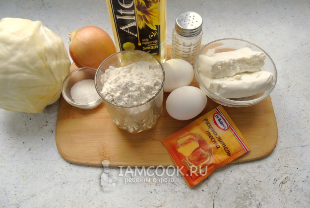 Соберите ингредиенты для приготовления пирожков из творожного теста с капустой в духовке.