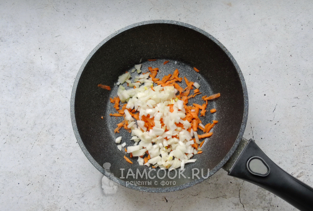 Тем временем займитесь начинкой для пирожков. Репчатый лук мелко нарежьте, а морковь натрите на терке. Выложите в сковороду с растительным маслом. Жарьте 3-4 минуты, до прозрачности лука.