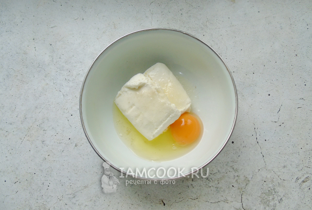 Приготовьте тесто. Творог выложите в миску. Насыпьте соль и сахар. Добавьте одно крупное яйцо или два небольших.