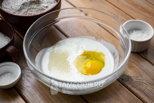 В миску зальем кефир, вобьем яйцо, добавим сахар.