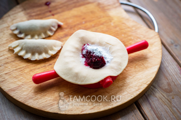 В центр каждого кружочка выложим по 2-3 ягодки вишни, чайную ложку сахара и щепотку крахмала.