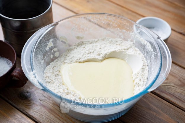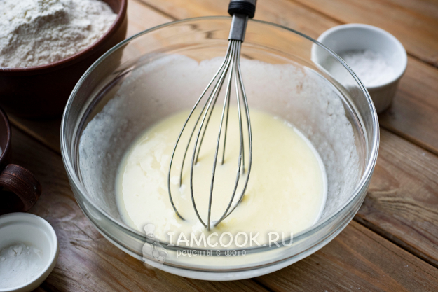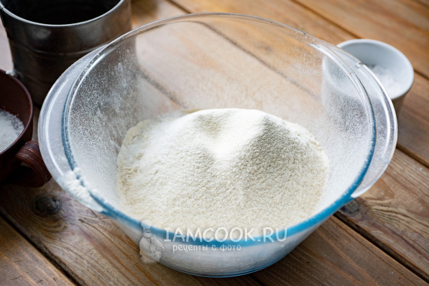 В отдельную миску просеем муку, добавим соду и соль. Перемешаем эти ингредиенты.