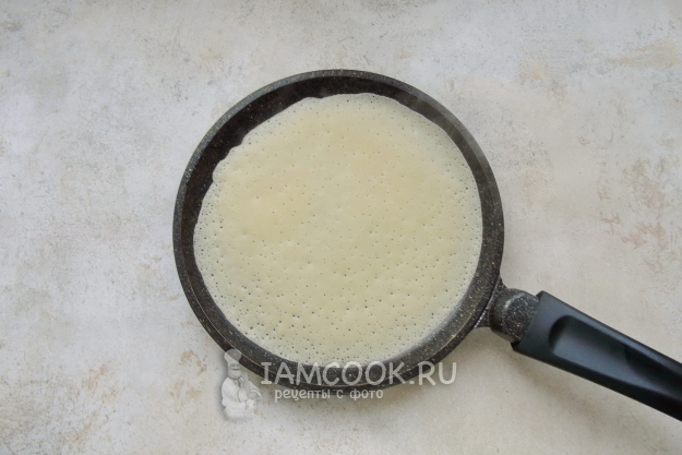 Сковороду с толстым дном или антипригарным покрытием хорошо нагрейте. Половником налейте тесто на сковороду, равномерно распределяя его тонким слоем.