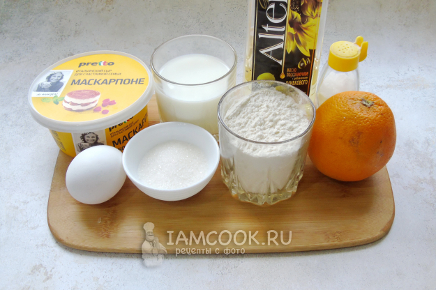 Соберите ингредиенты для приготовления блинов с маскарпоне и апельсином.