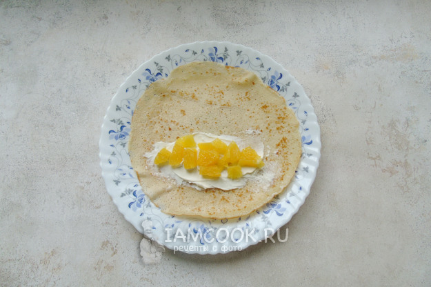В маскарпоне добавьте сахар по вкусу и перемешайте. Можно сахар вообще не добавлять. Столовую ложку сыра выложите на блин. Сверху разложите кусочки апельсина.