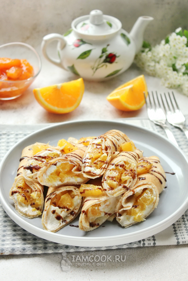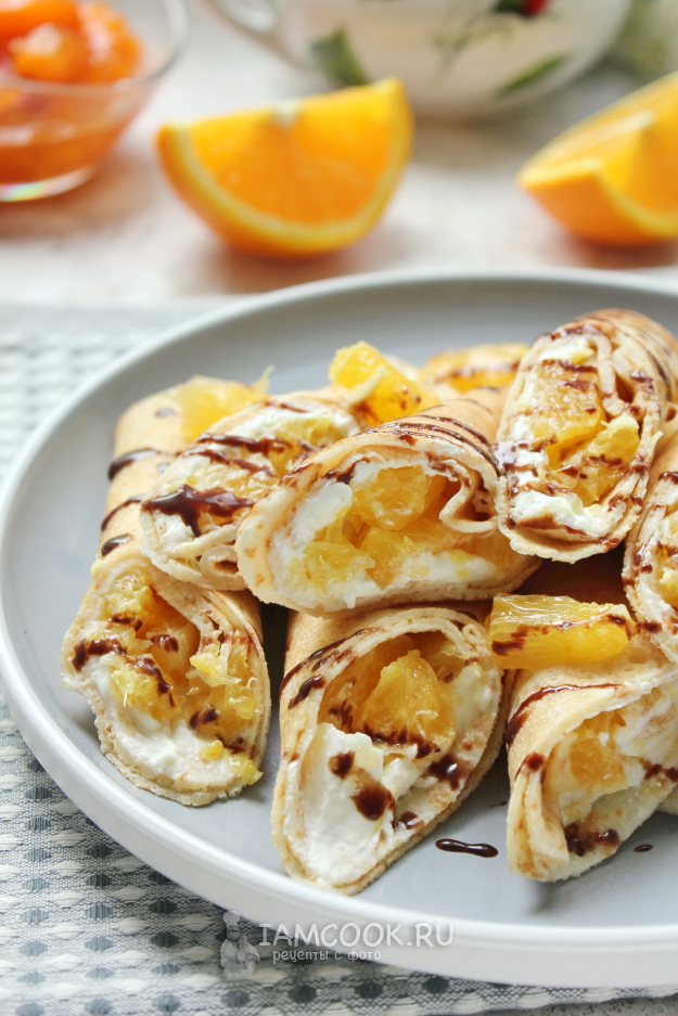 Нежные, ароматные и вкусные блины с маскарпоне и апельсином готовы.