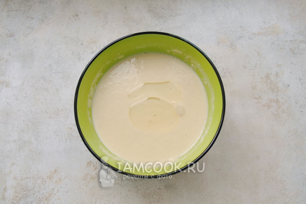 Замесите однородное, гладкое тесто без комочков. Налейте рафинированное подсолнечное масло и перемешайте тесто. Дайте ему постоять 15 минут.