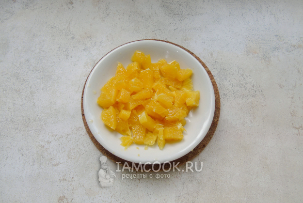 Апельсин помойте, очистите, удалите белую пленку. Нарежьте небольшими кубиками.