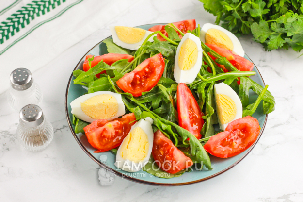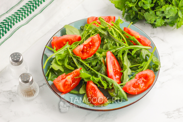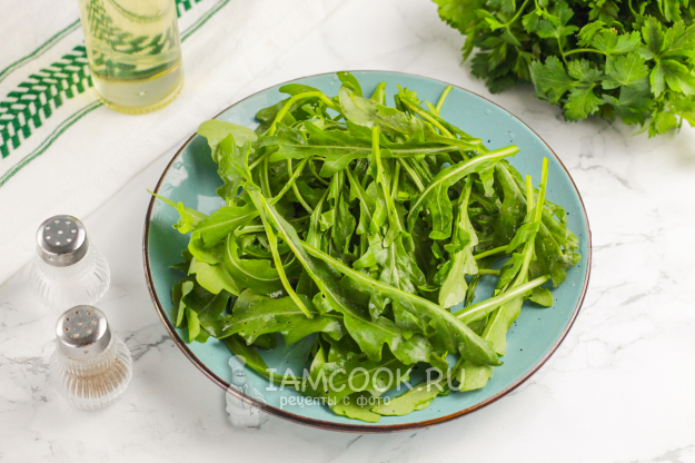 Промойте рукколу и стряхните лишнюю жидкость с листьев. Выложите их на тарелку в хаотичном порядке. Руккола должна быть некрупной, в мелких листьях меньше горечи.