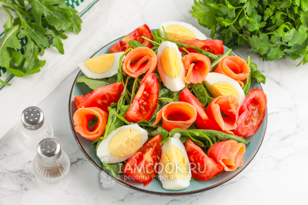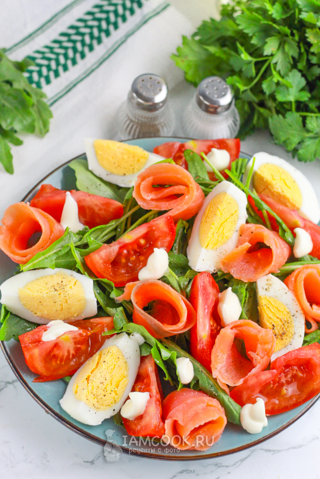 Добавьте капли майонеза или сбрызните всё заправкой, посолите, поперчите и подайте салат с рукколой и форелью к столу сразу же после приготовления.