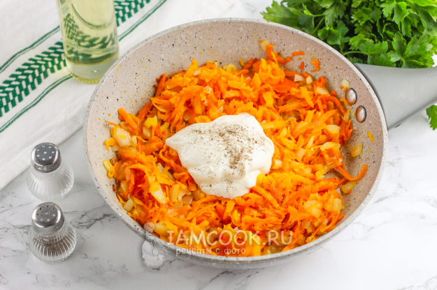 Когда овощи подрумянятся, добавьте сметану, соль и молотый черный перец. Перемешайте и влейте горячую воду. Доведите маринад до кипения.