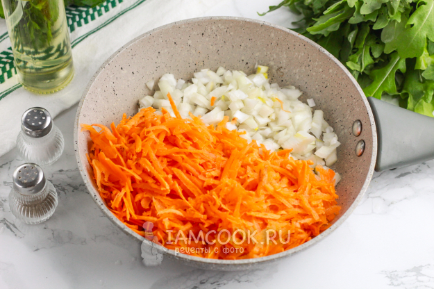 Очистите лук и морковь от кожуры, промойте в воде. Натрите морковь на терке с крупными ячейками, а лук нарежьте мелким кубиком. Влейте на сковороду растительное масло и прогрейте. Выложите овощные нарезки и обжарьте их 4-6 минут, до румяности, перемешивая.