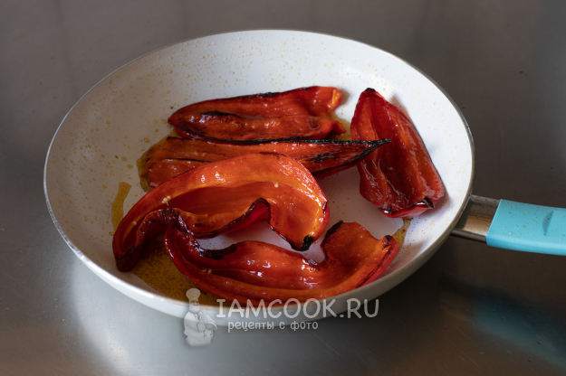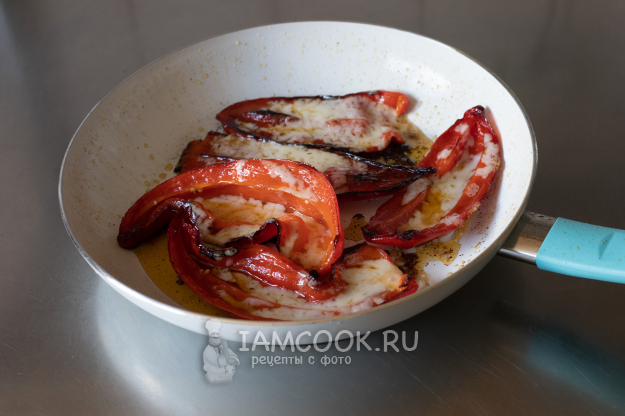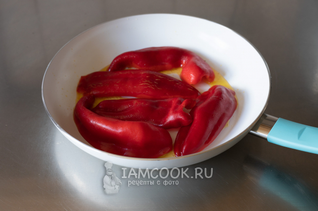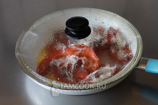 Положим перцы срезом вниз на предварительно разогретую сковороду и пожарим под крышкой на сильном огне 3-5 минут (до покоричневения хотя бы нескольких участков, соприкасающихся со сковородой).