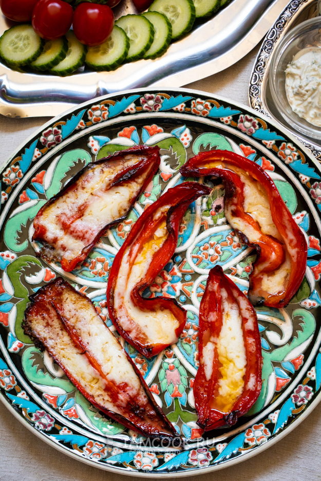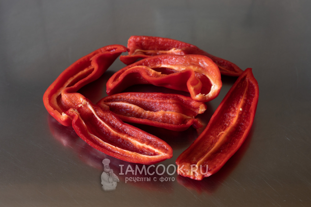 Перцы разрежем на половинки или четверти (если толстые или слишком длинные), чтобы их было удобно укладывать на сковороду. Удалим семена и плодоножки.