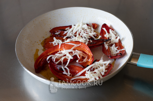 Закроем сковороду крышкой и пожарим болгарский перец с сыром на сковороде на сильном огне ещё 2-4 минуты.