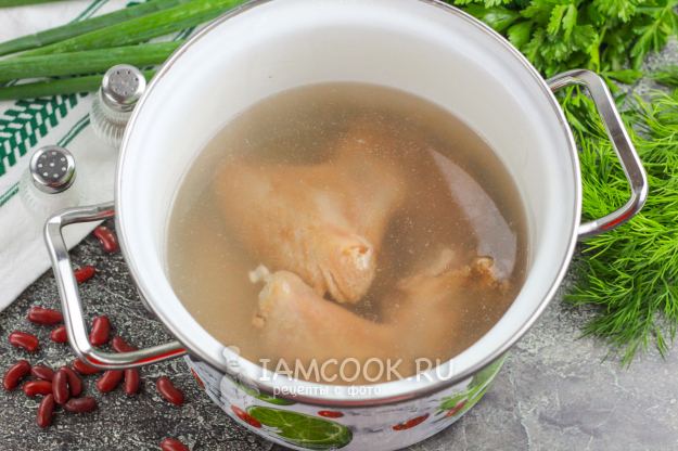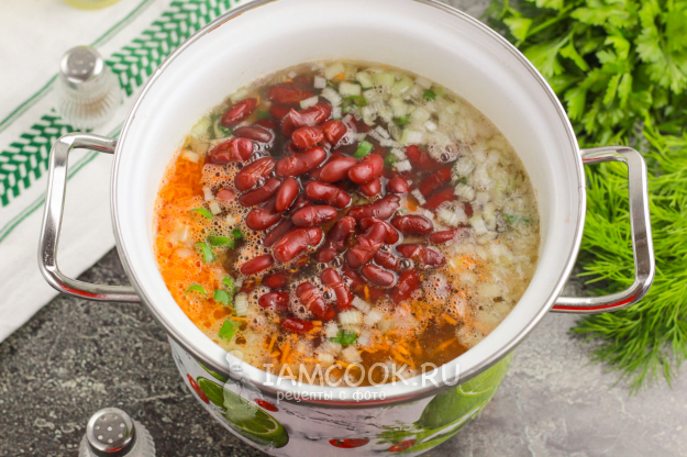 Выложите красную фасоль, слегка недоварив ее. Она доварится уже в супе, вберет в себя куриный бульон и станет более сочной.